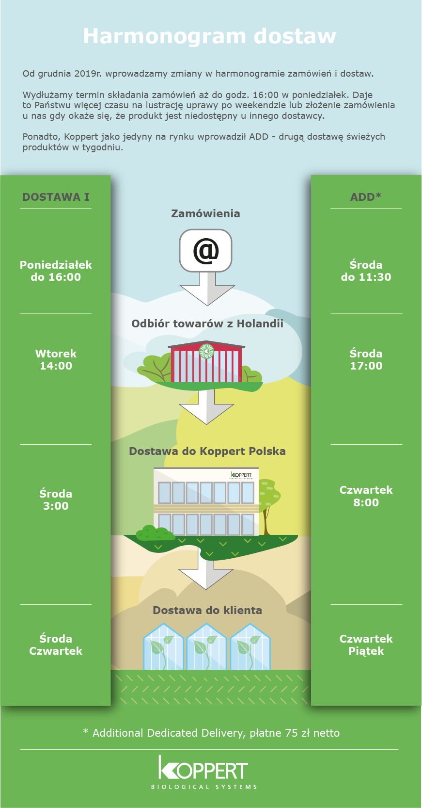 Koppert jako jedyny na polskim rynku wprowadził ADD - drugą dostawę świeżych produktów w tygodniu. Aby biologiczna ochrona roślina była skuteczna wymaga systematyczności i aplikacji w odpowiednim terminie, dlatego postanowiliśmy stworzyć Państwu możliwość dodatkowego zamówienia i dostawy w tym samym tygodniu.