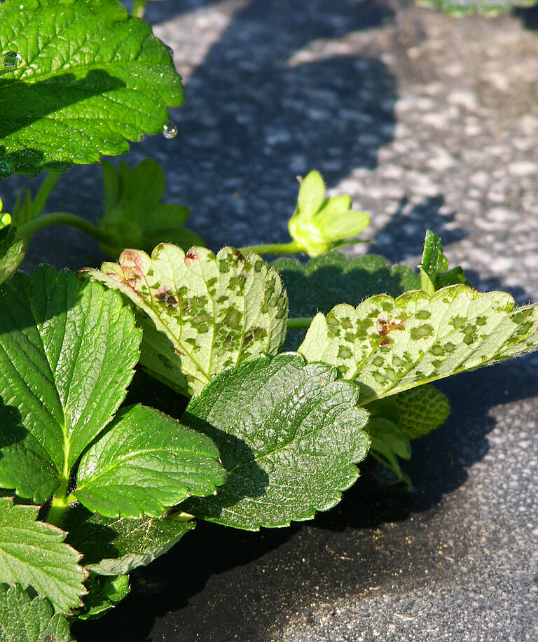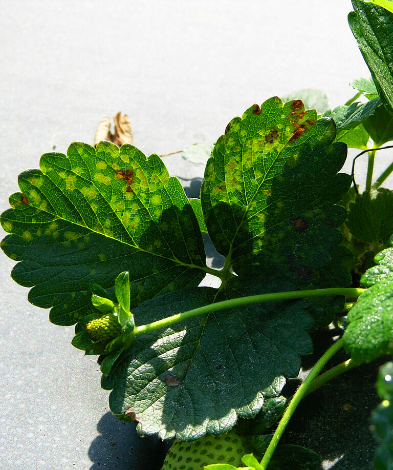 Gatunek Xanthomonas fragariae początkowo powoduje małe wodniste zmiany na spodniej stronie liścia. Następnie powiększają się one, tworząc kanciaste plamki, często ograniczone użyłkowaniem. Wyróżniającą cechą tej choroby jest sposób, w jaki wygląd plamek zmienia się pod wpływem użycia różnych źródeł światła: gdy używane jest światło odbite, zmiany wyglądają na ciemnozielone, ale gdy stosowane jest światło przechodzące, są one półprzezroczyste. W wilgotnych warunkach na spodniej stronie liścia tworzy się lepki wysięk bakteryjny. Ten wysięk zmienia się na biały nalot po wyschnięciu. Powiększające się zmiany mogą się zlewać, a później mogą być widoczne na górnej stronie liścia jako nieregularne plamy, które są najpierw czerwonawobrązowe, a następnie nekrotyczne. Najważniejsze są objawy na liściach, ale infekcja może także zaatakować wszystkie typy naczyń korony, tworząc uszkodzenia podobne do zmian występujących w zakażeniu patogenem Phytophthora fragariae.