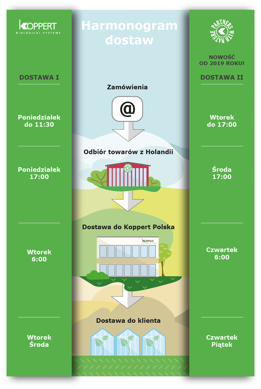 Wychodząc naprzeciw oczekiwaniom klientów, Koppert Polska wprowadził możliwość domówienia produktów biologicznych poza standardowym trybem zamówień. Biologiczna ochrona roślin, aby była skuteczna, wymaga systematyczności i aplikacji w odpowiednim terminie. Dlatego zdecydowaliśmy się dostarczać towary do naszych klientów nie raz, a dwa razy w tygodniu.