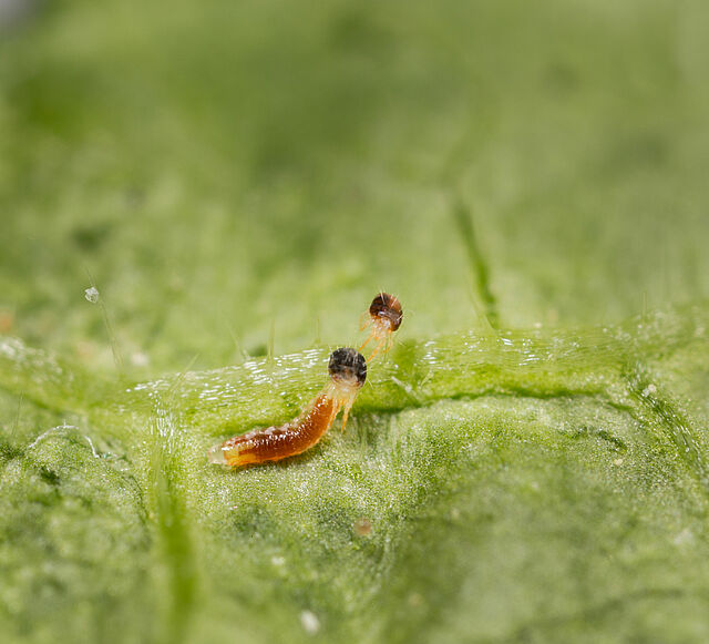 Stadium larwalne: Kolor larwy jest zwykle pomarańczowy, ale może się różnić w zależności od koloru zjedzonej ofiary i czasami może być żółty lub czerwony. Zaraz po wydostaniu się z jaja larwa jest żółtawobiała. Jaja i pierwsze stadia larwalne są bardzo trudne do znalezienia w uprawie ze względu na ich niewielki rozmiar i kolor.