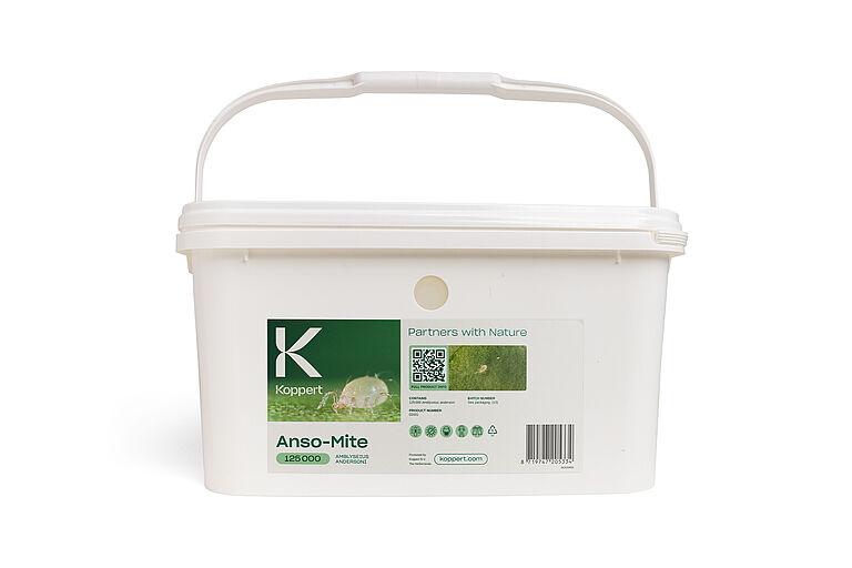 Dawkowanie Anso-Mite zależy od klimatu, uprawy i zagęszczenia szkodników i zawsze powinno być dostosowane do konkretnej sytuacji. Wprowadzanie należy rozpocząć zapobiegawczo wkrótce po zasadzeniu uprawy. Dawki zwykle wahają się od 50-250 na m2/uwolnienie. Uwolnienia należy powtarzać co najmniej 3 razy w odstępach tygodniowych lub do momentu uzyskania kontroli. Skonsultuj się z doradcą Koppert lub uznanym dystrybutorem produktów Koppert w celu uzyskania porady na temat najlepszej strategii w danej sytuacji.