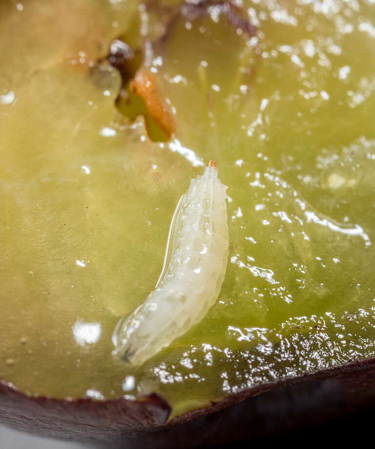 Po złożeniu jaj przewody oddechowe wystają z owoców, ale trudno je dostrzec. Żerowanie larw na owocach sprawia, że jej tkanki się zapadają. Nawet jeśli do tego nie dojdzie, obecność larw w owocach powoduje, że stają się one niezdatne do sprzedaży. Nakłucia wykonane podczas składania jaj przez D. suzukii naraża owoce na atak wtórnych patogenów (np. bakterii, grzybów i drożdży). Pogorszenie stanu owoców może także zwiększyć ich podatność na atak innych gatunków muszek Drosophila. D. suzukii ma wielu różnych żywicieli, a szczególnie narażone na jego atak są owoce cienkoskóre (np. maliny, jeżyny, jagody, truskawki) oraz owoce pestkowe (np. czereśnie, śliwki).
