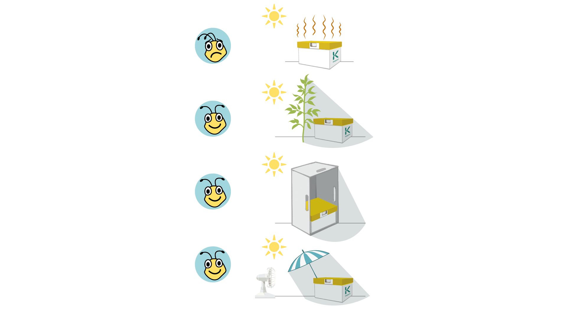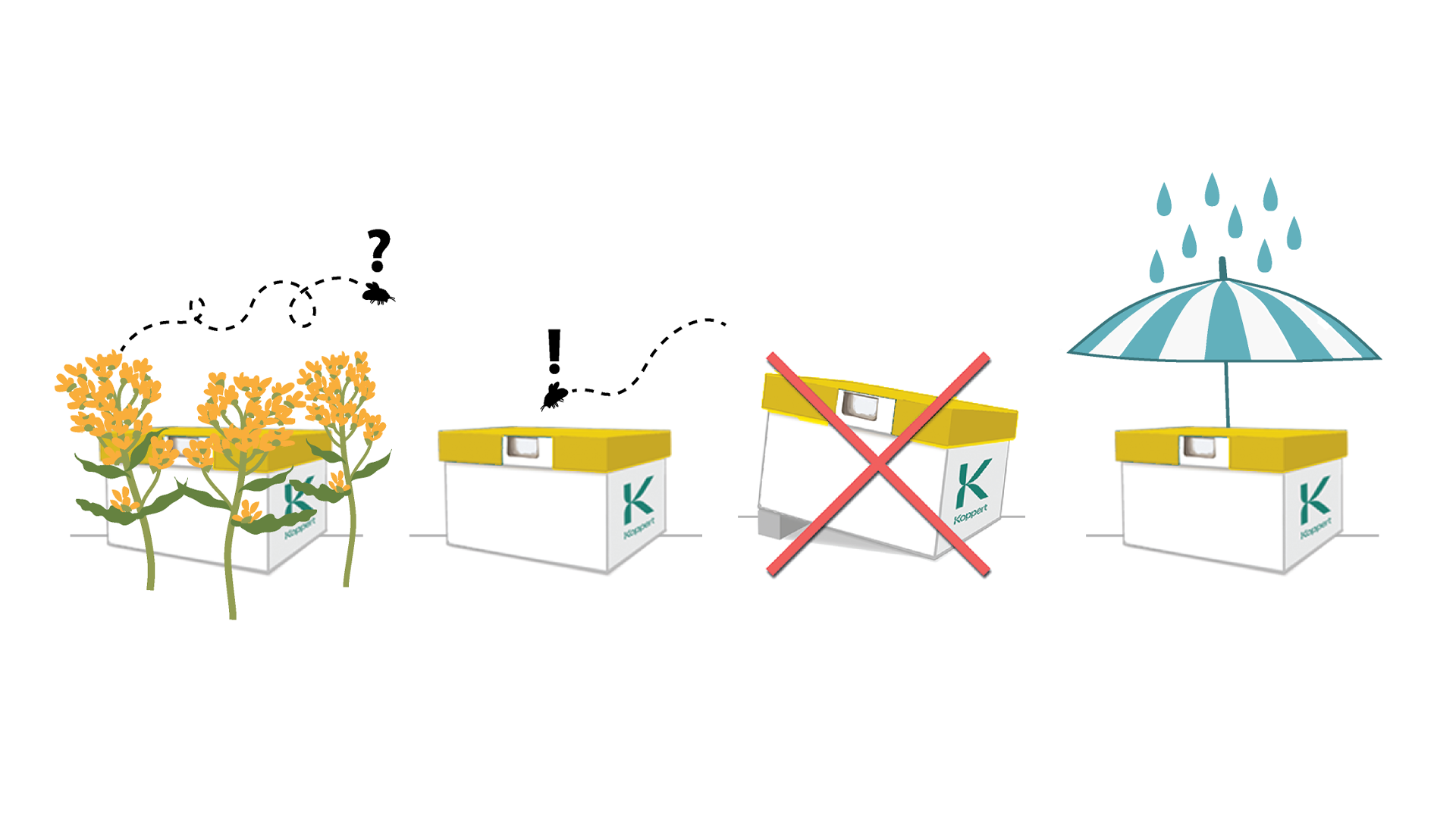 W tych porach roku zaleca się umieszczenie uli na wysokości 20-60 cm nad ziemią po południowej stronie ścieżki. Taka lokalizacja zapewnia odpowiednie zacienienie uli przez cały dzień. W przypadku niewystarczającego zacienienia należy podjąć dodatkowe środki, zwłaszcza jesienią, gdy bezprzewodowy system Beehome jest zamknięty. W okresie wysokich temperatur należy chronić trzmiele przed upałem.